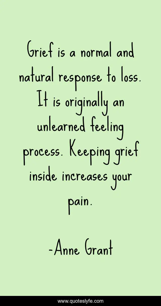 This page presents the quote "Grief is a normal and natural response to loss. It is originally an unlearned feeling process. Keeping grief inside increases your pain.". Author of this quote is Anne Grant. This quote is about grief, loss, pain,.