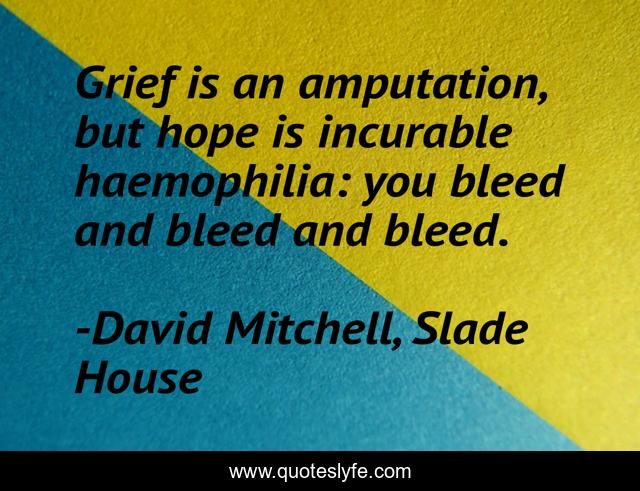 This page presents the quote "Grief is an amputation, but hope is incurable haemophilia: you bleed and bleed and bleed.". Author of this quote is David Mitchell, Slade House. This quote is about grief, hope-and-despair, grief-and-loss,.