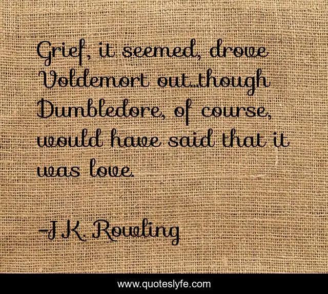This page presents the quote "Grief, it seemed, drove Voldemort out...though Dumbledore, of course, would have said that it was love.". Author of this quote is J.K. Rowling. This quote is about grief, sadness, love, affection,.