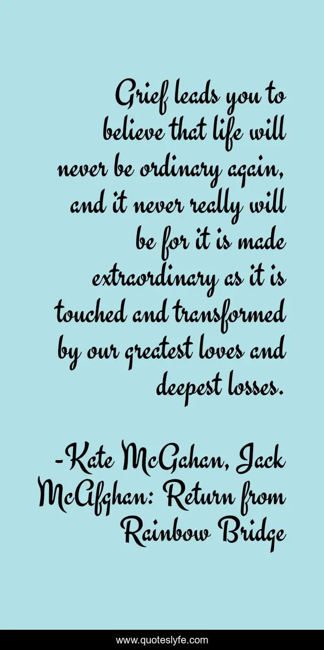 This page presents the quote "Grief leads you to believe that life will never be ordinary again, and it never really will be for it is made extraordinary as it is touched and transformed by our greatest loves and deepest losses.". Author of this quote is Kate McGahan, Jack McAfghan: Return from Rainbow Bridge. This quote is about loss, transform, grief, extraordinary, learn, grow,.