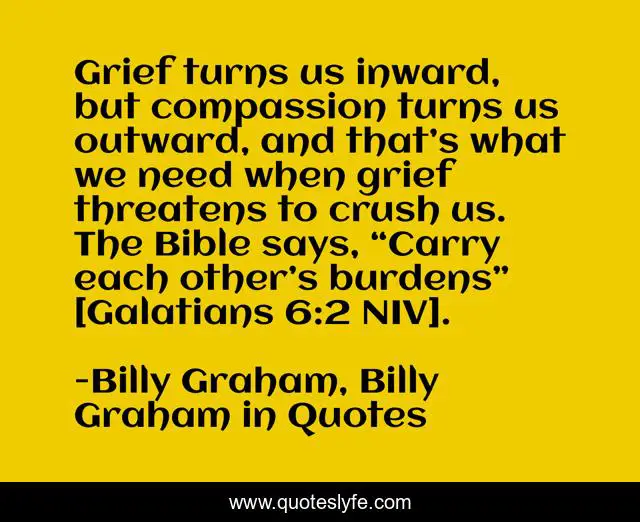 This page presents the quote "Grief turns us inward, but compassion turns us outward, and that’s what we need when grief threatens to crush us. The Bible says, “Carry each other’s burdens” [Galatians 6:2 NIV].". Author of this quote is Billy Graham, Billy Graham in Quotes. This quote is about grief, billy-graham,.