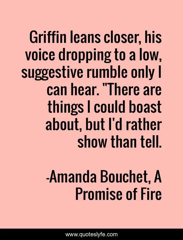 This page presents the quote "Griffin leans closer, his voice dropping to a low, suggestive rumble only I can hear. "There are things I could boast about, but I'd rather show than tell.". Author of this quote is Amanda Bouchet, A Promise of Fire. This quote is about poseidon, epic-romantic-fantasy, hades, dragons, she-dragons, cerberus,.