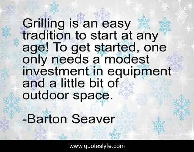 This page presents the quote "Grilling is an easy tradition to start at any age! To get started, one only needs a modest investment in equipment and a little bit of outdoor space.". Author of this quote is Barton Seaver. This quote is about start, age, easy,.