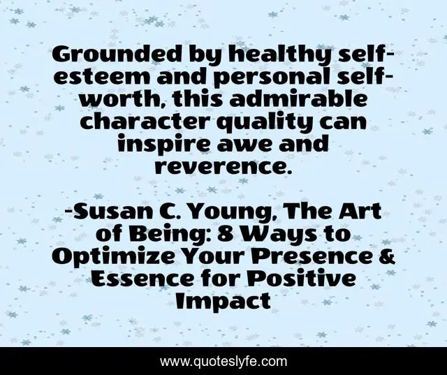 "Susan C. Young, The Art of Being: 8 Ways to Optimize Your Presence & Essence for Positive Impact Quotes." Quoteslyfe.com, 2025. Mon. 08 Dec. 2025. <https://www.quoteslyfe.com/quote/Grounded-by-healthy-self-esteem-and-personal-153131>.