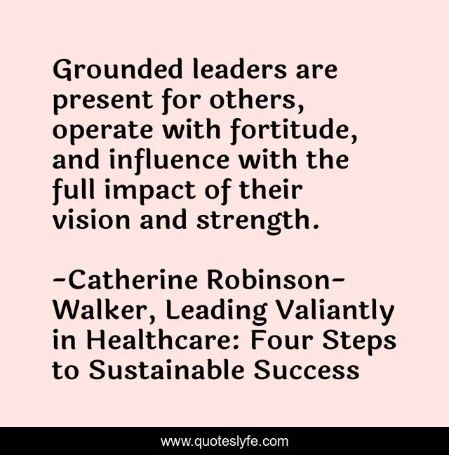 This page presents the quote "Grounded leaders are present for others, operate with fortitude, and influence with the full impact of their vision and strength.". Author of this quote is Catherine Robinson-Walker, Leading Valiantly in Healthcare: Four Steps to Sustainable Success. This quote is about fortitude, leadership, vision, healthcare,.