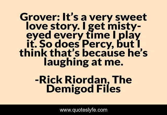 This page presents the quote "Grover: It’s a very sweet love story. I get misty-eyed every time I play it. So does Percy, but I think that’s because he’s laughing at me.". Author of this quote is Rick Riordan, The Demigod Files. This quote is about reed-pipe, funny, comedy, grover-underwood,.
