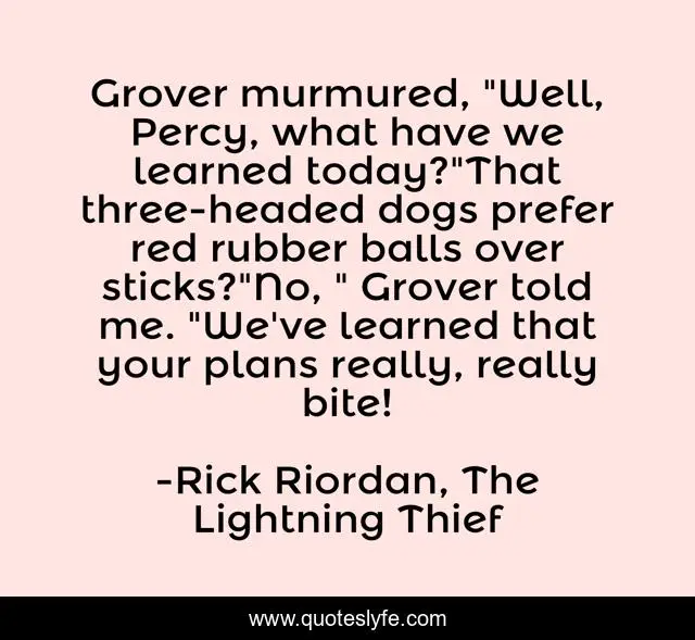 Grover murmured, "Well, Percy, what have we learned today?"That three-headed dogs prefer red rubber balls over sticks?"No, " Grover told me. "We've learned that your plans really, really bite!