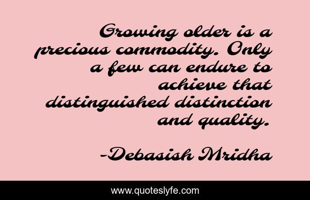 This page presents the quote "Growing older is a precious commodity. Only a few can endure to achieve that distinguished distinction and quality.". Author of this quote is Debasish Mridha. This quote is about miraboli, oscar-wilde, philosophy, debasish-mridha, quotes, gandhi, inspirational, enthusiasm, growing-older,.