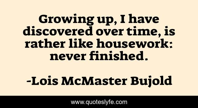 This page presents the quote "Growing up, I have discovered over time, is rather like housework: never finished.". Author of this quote is Lois McMaster Bujold. This quote is about housework, growing-up,.
