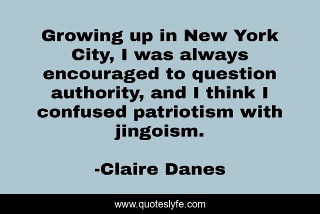 This page presents the quote "Growing up in New York City, I was always encouraged to question authority, and I think I confused patriotism with jingoism.". Author of this quote is Claire Danes. This quote is about city, growing up, confused,.