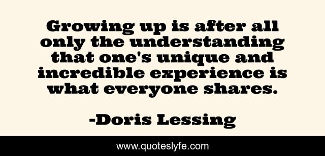 This page presents the quote "Growing up is after all only the understanding that one's unique and incredible experience is what everyone shares.". Author of this quote is Doris Lessing. .