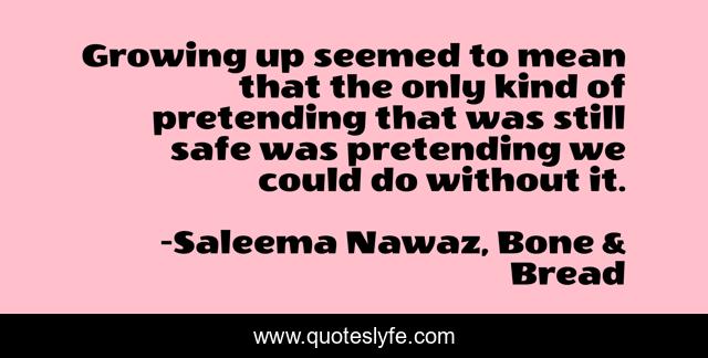 This page presents the quote "Growing up seemed to mean that the only kind of pretending that was still safe was pretending we could do without it.". Author of this quote is Saleema Nawaz, Bone & Bread. This quote is about growing-up, pretending,.