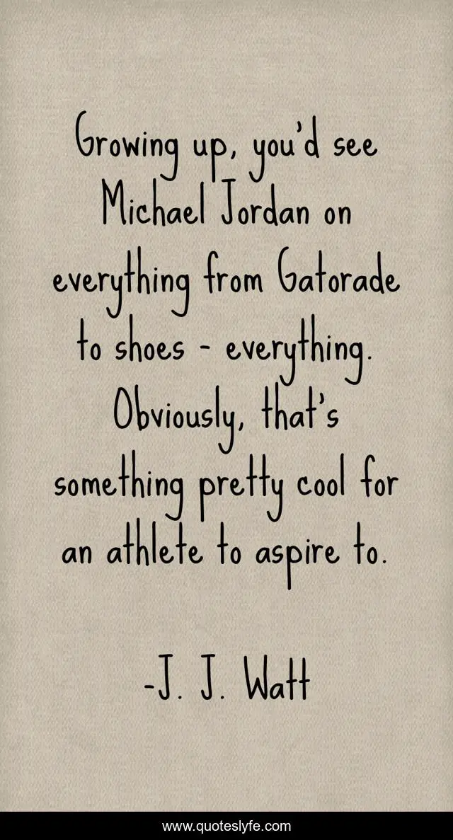 This page presents the quote "Growing up, you'd see Michael Jordan on everything from Gatorade to shoes - everything. Obviously, that's something pretty cool for an athlete to aspire to.". Author of this quote is J. J. Watt. This quote is about growing up, shoes,.