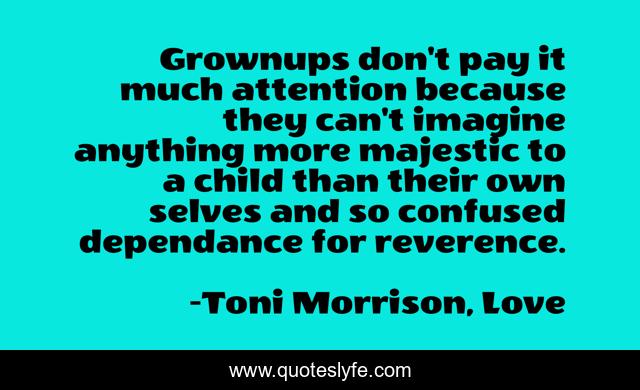 This page presents the quote "Grownups don't pay it much attention because they can't imagine anything more majestic to a child than their own selves and so confused dependance for reverence.". Author of this quote is Toni Morrison, Love. This quote is about adults, self-absorbed, children,.