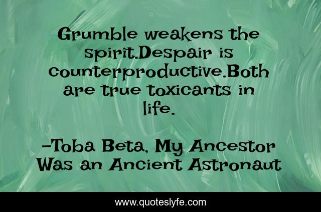 This page presents the quote "Grumble weakens the spirit.Despair is counterproductive.Both are true toxicants in life.". Author of this quote is Toba Beta, My Ancestor Was an Ancient Astronaut. This quote is about grumble, despair, poison,.