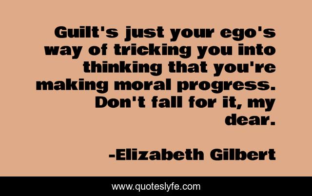 This page presents the quote "Guilt's just your ego's way of tricking you into thinking that you're making moral progress. Don't fall for it, my dear.". Author of this quote is Elizabeth Gilbert. This quote is about ego, guilt, morals,.