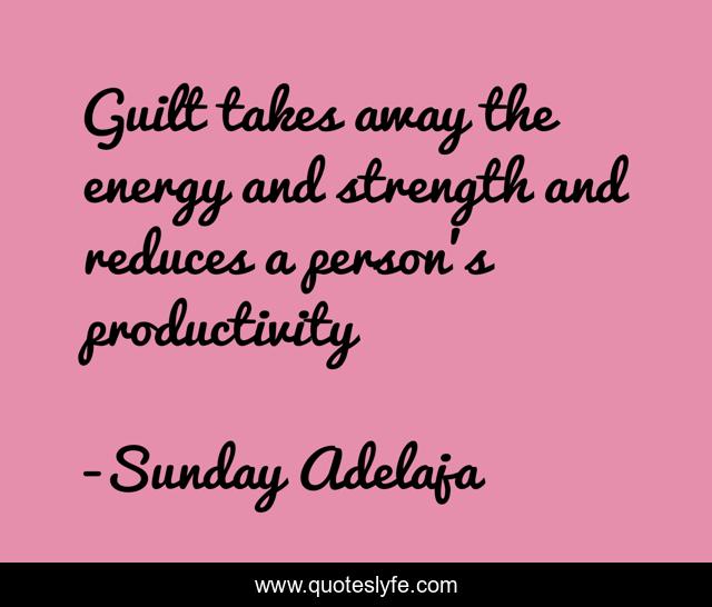 This page presents the quote "Guilt takes away the energy and strength and reduces a person’s productivity". Author of this quote is Sunday Adelaja. This quote is about life, strength, productivity, goal, away, mission, calling, reduces, guilt,.