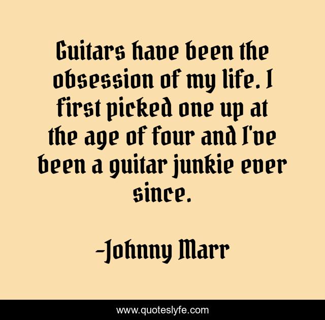 This page presents the quote "Guitars have been the obsession of my life. I first picked one up at the age of four and I've been a guitar junkie ever since.". Author of this quote is Johnny Marr. This quote is about guitar, life, my life,.