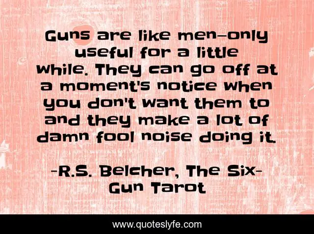 This page presents the quote "Guns are like men—only useful for a little while. They can go off at a moment's notice when you don't want them to and they make a lot of damn fool noise doing it.". Author of this quote is R.S. Belcher, The Six-Gun Tarot. This quote is about men, guns,.