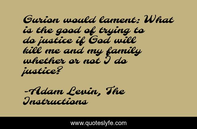 This page presents the quote "Gurion would lament: What is the good of trying to do justice if God will kill me and my family whether or not I do justice?". Author of this quote is Adam Levin, The Instructions. This quote is about justice, motive, reason,.
