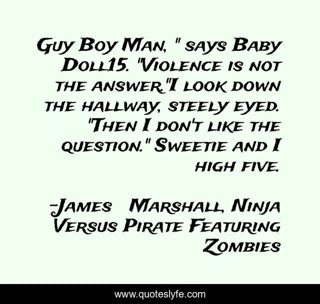 This page presents the quote "Guy Boy Man, " says Baby Doll15. "Violence is not the answer."I look down the hallway, steely eyed. "Then I don't like the question." Sweetie and I high five.". Author of this quote is James Marshall, Ninja Versus Pirate Featuring Zombies. .