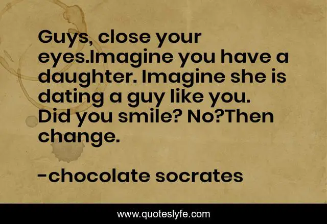 This page presents the quote "Guys, close your eyes.Imagine you have a daughter. Imagine she is dating a guy like you. Did you smile? No?Then change.". Author of this quote is chocolate socrates. This quote is about philosophical, philosophy, philosophy-of-life,.