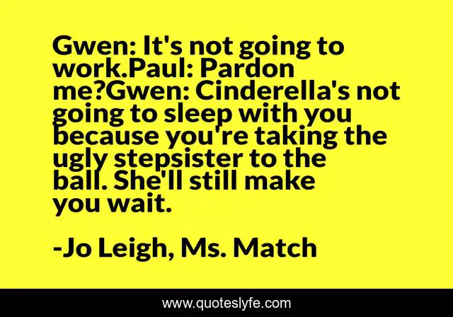This page presents the quote "Gwen: It's not going to work.Paul: Pardon me?Gwen: Cinderella's not going to sleep with you because you're taking the ugly stepsister to the ball. She'll still make you wait.". Author of this quote is Jo Leigh, Ms. Match. This quote is about romance, cinderella, humor,.