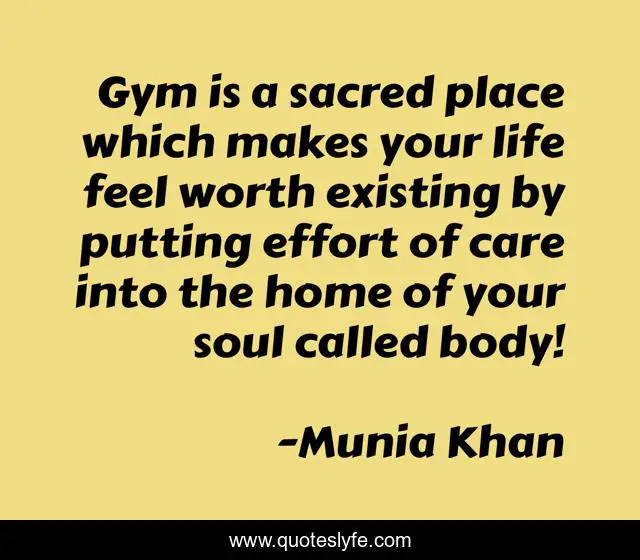This page presents the quote "Gym is a sacred place which makes your life feel worth existing by putting effort of care into the home of your soul called body!". Author of this quote is Munia Khan. This quote is about fitness-inspiration, gymnasium, existing, fitness-motivation, home, existence, health-and-fitness, physical-health, work-hard,.