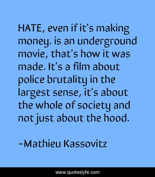 This page presents the quote "HATE, even if it's making money. is an underground movie, that's how it was made. It's a film about police brutality in the largest sense, it's about the whole of society and not just about the hood.". Author of this quote is Mathieu Kassovitz. This quote is about society, making money, hate,.