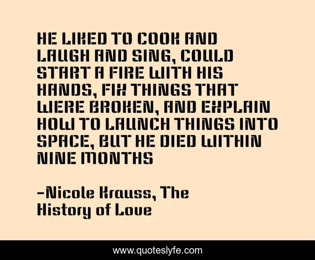 This page presents the quote "HE LIKED TO COOK AND LAUGH AND SING, COULD START A FIRE WITH HIS HANDS, FIX THINGS THAT WERE BROKEN, AND EXPLAIN HOW TO LAUNCH THINGS INTO SPACE, BUT HE DIED WITHIN NINE MONTHS". Author of this quote is Nicole Krauss, The History of Love. This quote is about beautiful, death, father, cancer,.