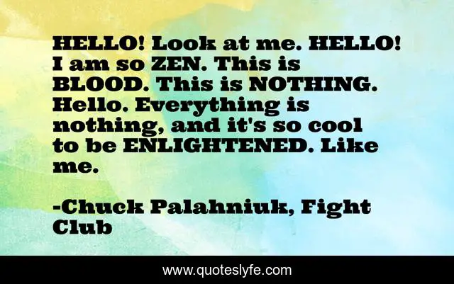 This page presents the quote "HELLO! Look at me. HELLO! I am so ZEN. This is BLOOD. This is NOTHING. Hello. Everything is nothing, and it's so cool to be ENLIGHTENED. Like me.". Author of this quote is Chuck Palahniuk, Fight Club. .