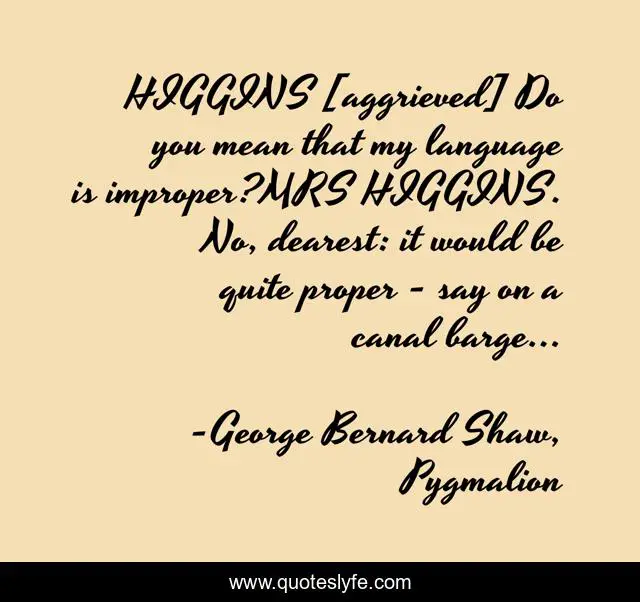 This page presents the quote "HIGGINS [aggrieved] Do you mean that my language is improper?MRS HIGGINS. No, dearest: it would be quite proper - say on a canal barge...". Author of this quote is George Bernard Shaw, Pygmalion. This quote is about language, improper-english,.