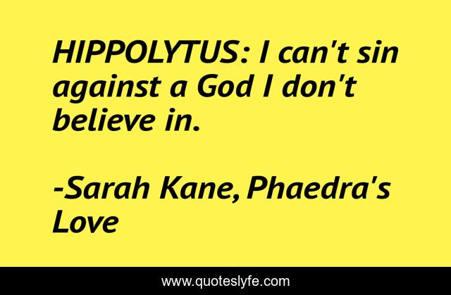 This page presents the quote "HIPPOLYTUS: I can't sin against a God I don't believe in.". Author of this quote is Sarah Kane, Phaedra's Love. This quote is about nonbeliever, hippolytus, godless, sin,.