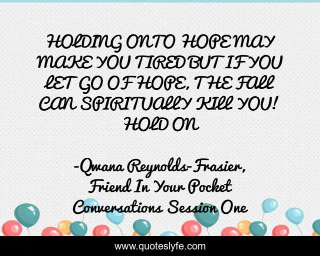 "Qwana Reynolds-Frasier, Friend In Your Pocket Conversations Session One Quotes." Quoteslyfe.com, 2025. Mon. 08 Dec. 2025. <https://www.quoteslyfe.com/quote/HOLDING-ONTO-HOPE-MAY-MAKE-YOU-TIRED-77796>.