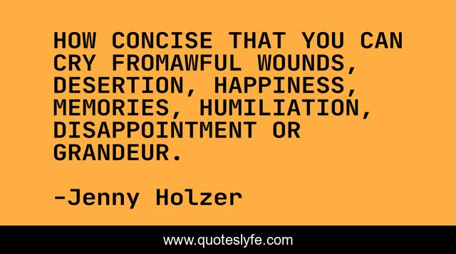 This page presents the quote "HOW CONCISE THAT YOU CAN CRY FROMAWFUL WOUNDS, DESERTION, HAPPINESS, MEMORIES, HUMILIATION, DISAPPOINTMENT OR GRANDEUR.". Author of this quote is Jenny Holzer. This quote is about crying, impulse, jenny-holzer,.