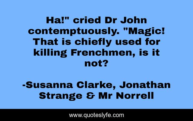 This page presents the quote "Ha!" cried Dr John contemptuously. "Magic! That is chiefly used for killing Frenchmen, is it not?". Author of this quote is Susanna Clarke, Jonathan Strange & Mr Norrell. This quote is about great-britain, magic, france,.