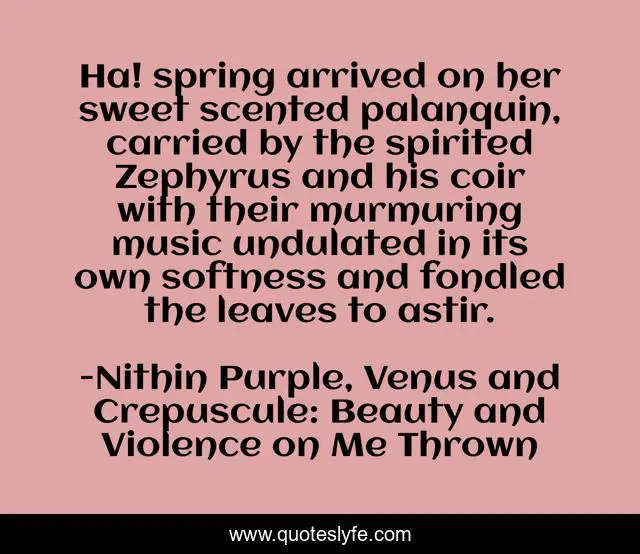 "Nithin Purple, Venus and Crepuscule: Beauty and Violence on Me Thrown Quotes." Quoteslyfe.com, 2025. Sat. 06 Dec. 2025. <https://www.quoteslyfe.com/quote/Ha-spring-arrived-on-her-sweet-scented-66113>.