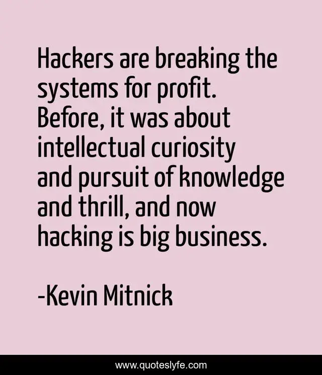 This page presents the quote "Hackers are breaking the systems for profit. Before, it was about intellectual curiosity and pursuit of knowledge and thrill, and now hacking is big business.". Author of this quote is Kevin Mitnick. This quote is about profit, knowledge, curiosity,.