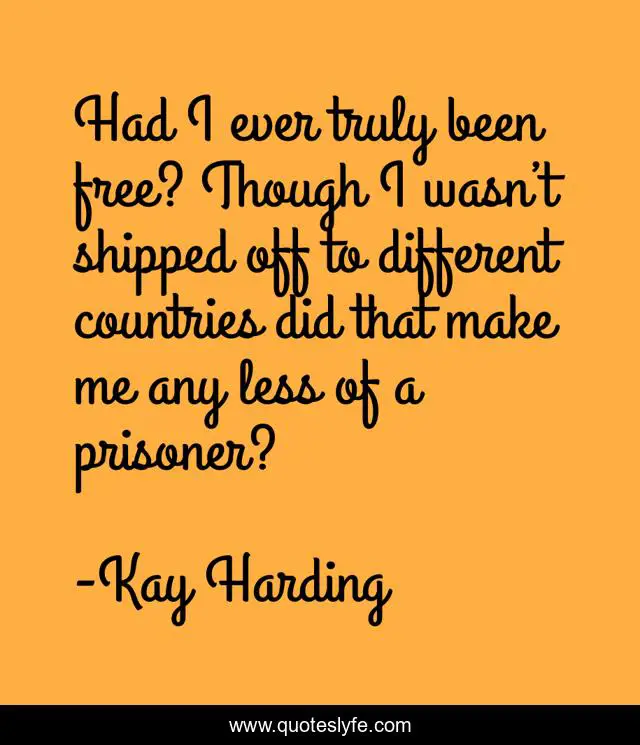 This page presents the quote "Had I ever truly been free? Though I wasn’t shipped off to different countries did that make me any less of a prisoner?". Author of this quote is Kay Harding. .