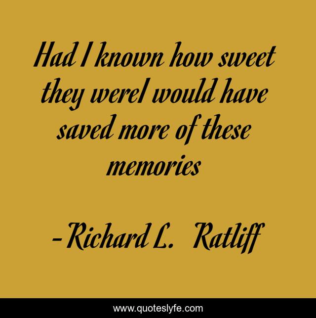 This page presents the quote "Had I known how sweet they wereI would have saved more of these memories". Author of this quote is Richard L. Ratliff. This quote is about past-memories, memories, sweet-memories, past, known, saved, more,.