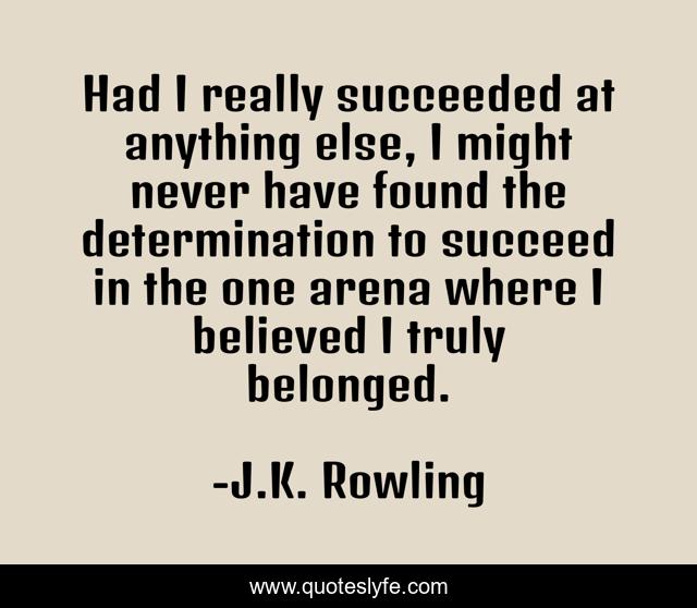 This page presents the quote "Had I really succeeded at anything else, I might never have found the determination to succeed in the one arena where I believed I truly belonged.". Author of this quote is J.K. Rowling. This quote is about failure, inspiration, success, writing,.