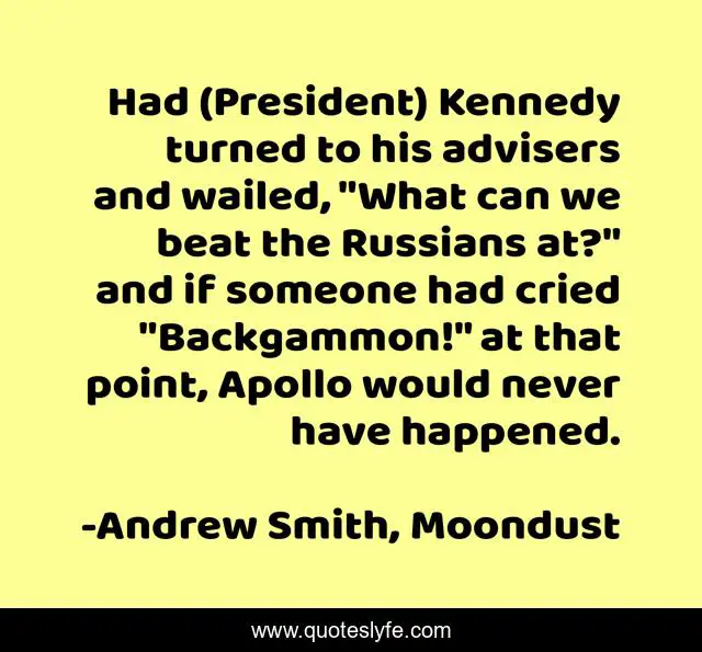 This page presents the quote "Had (President) Kennedy turned to his advisers and wailed, "What can we beat the Russians at?" and if someone had cried "Backgammon!" at that point, Apollo would never have happened.". Author of this quote is Andrew Smith, Moondust. This quote is about space-exploration, moon,.