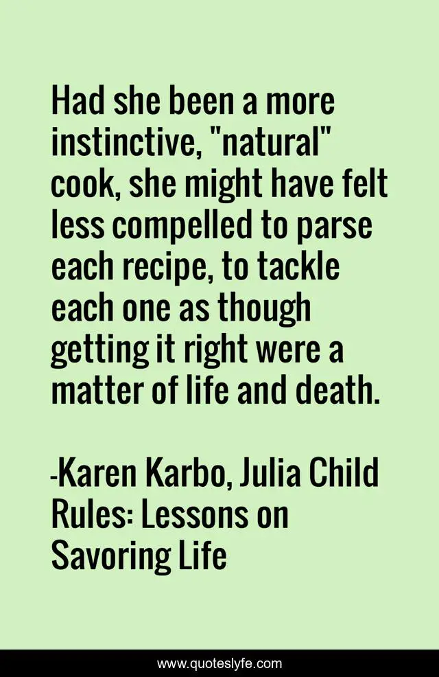 This page presents the quote "Had she been a more instinctive, "natural" cook, she might have felt less compelled to parse each recipe, to tackle each one as though getting it right were a matter of life and death.". Author of this quote is Karen Karbo, Julia Child Rules: Lessons on Savoring Life. This quote is about cooking, julia-child, hard-work,.