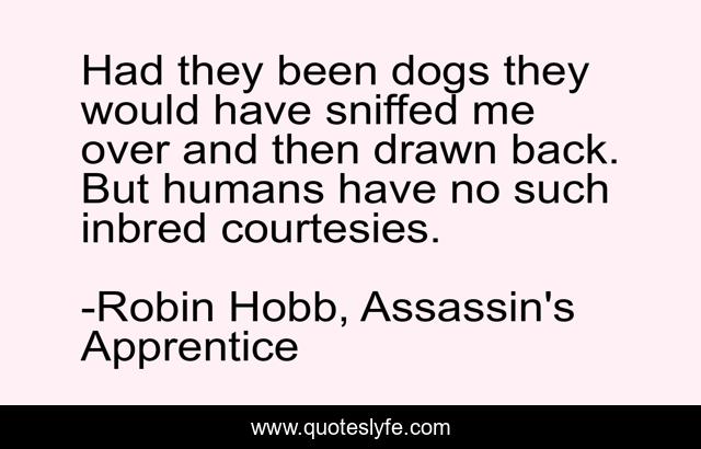 This page presents the quote "Had they been dogs they would have sniffed me over and then drawn back. But humans have no such inbred courtesies.". Author of this quote is Robin Hobb, Assassin's Apprentice. This quote is about fitzchivalry-farseer, dogs, old-wit,.