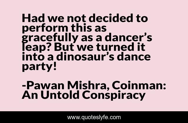 This page presents the quote "Had we not decided to perform this as gracefully as a dancer’s leap? But we turned it into a dinosaur’s dance party!". Author of this quote is Pawan Mishra, Coinman: An Untold Conspiracy. This quote is about bullying, discipline, dancer, gracefully,.