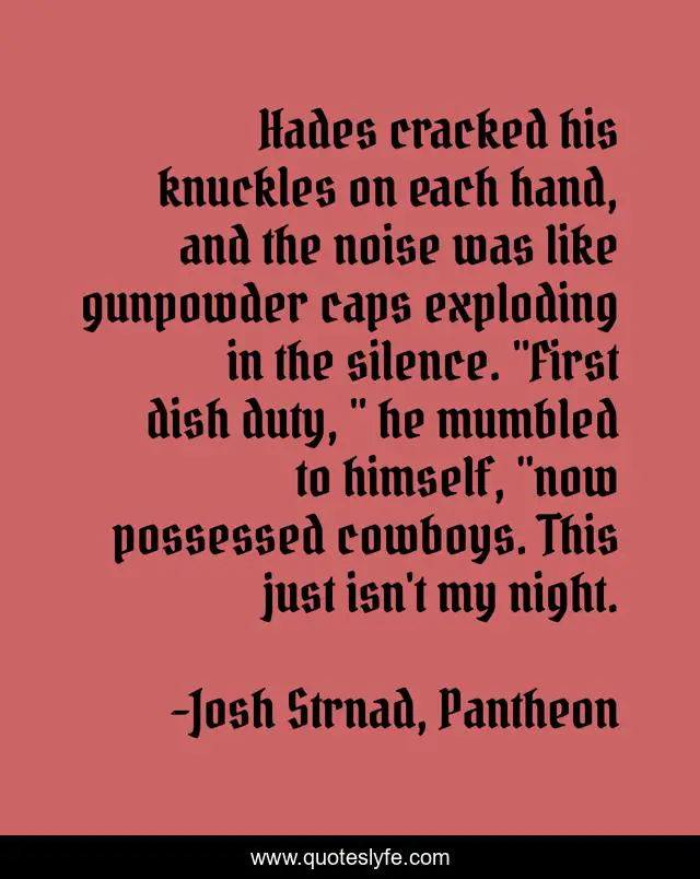 This page presents the quote "Hades cracked his knuckles on each hand, and the noise was like gunpowder caps exploding in the silence. "First dish duty, " he mumbled to himself, "now possessed cowboys. This just isn't my night.". Author of this quote is Josh Strnad, Pantheon. This quote is about romance, speculative-fiction, mythology, cowboy,.