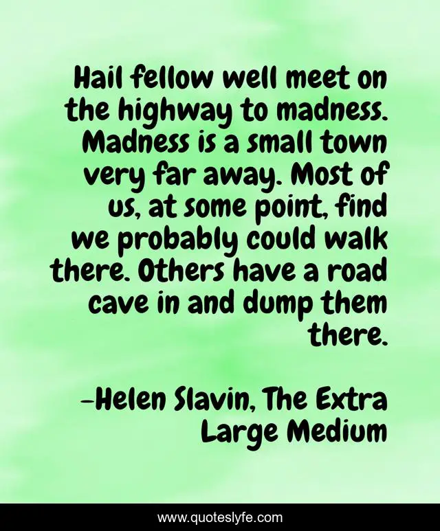 This page presents the quote "Hail fellow well meet on the highway to madness. Madness is a small town very far away. Most of us, at some point, find we probably could walk there. Others have a road cave in and dump them there.". Author of this quote is Helen Slavin, The Extra Large Medium. This quote is about crazy, madness,.