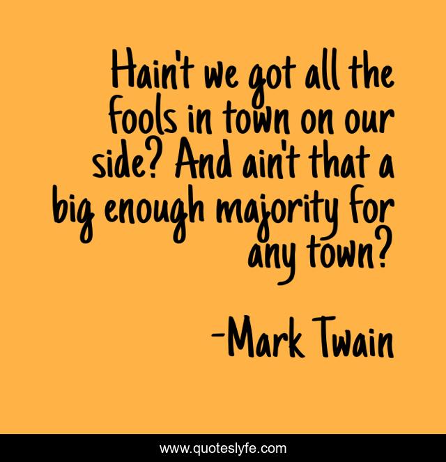 This page presents the quote "Hain't we got all the fools in town on our side? And ain't that a big enough majority for any town?". Author of this quote is Mark Twain. This quote is about fools, foolishness,.