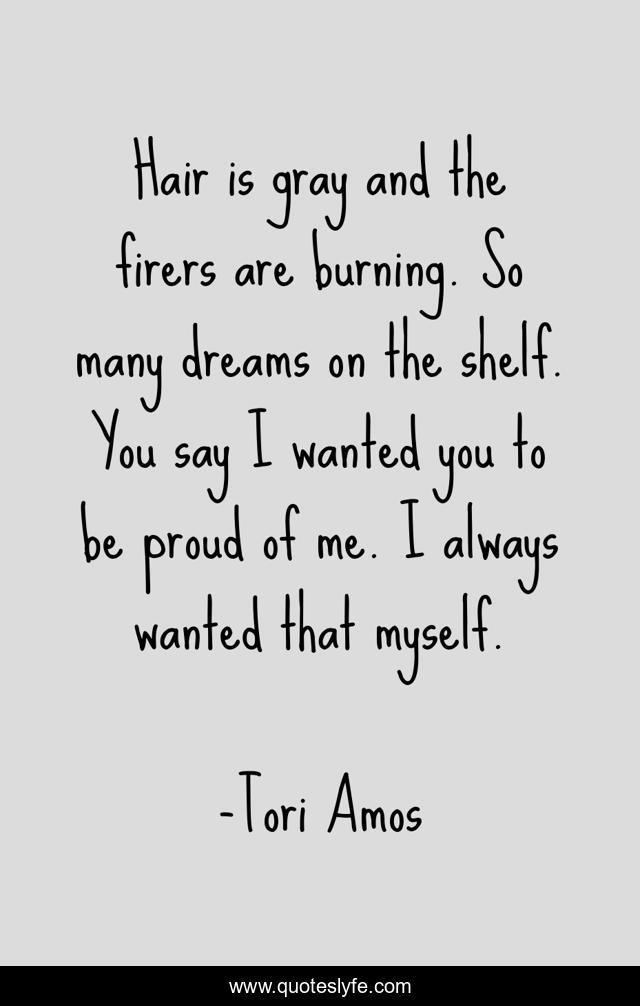 This page presents the quote "Hair is gray and the firers are burning. So many dreams on the shelf. You say I wanted you to be proud of me. I always wanted that myself.". Author of this quote is Tori Amos. This quote is about winter, tori, pop, music, amos, pride, songs,.