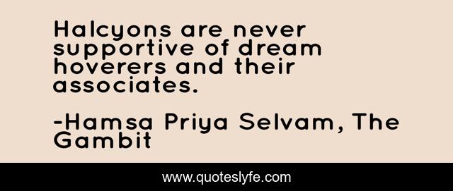 "Hamsa Priya Selvam, The Gambit Quotes." Quoteslyfe.com, 2025. Sat. 06 Dec. 2025. <https://www.quoteslyfe.com/quote/Halcyons-are-never-supportive-of-dream-hoverers-100785>.